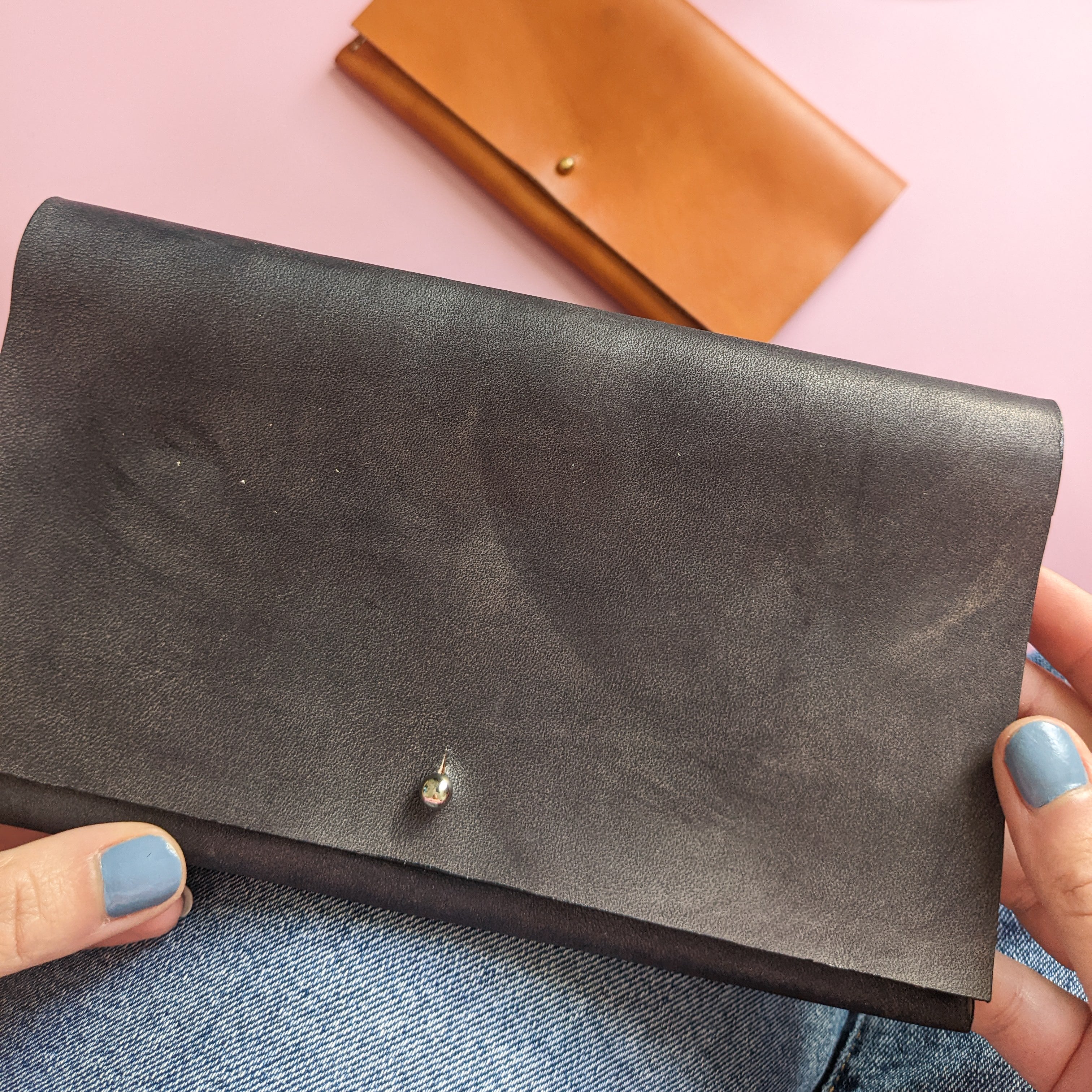 Leather clutch bag, with belt loop on back for 1 inch belt.