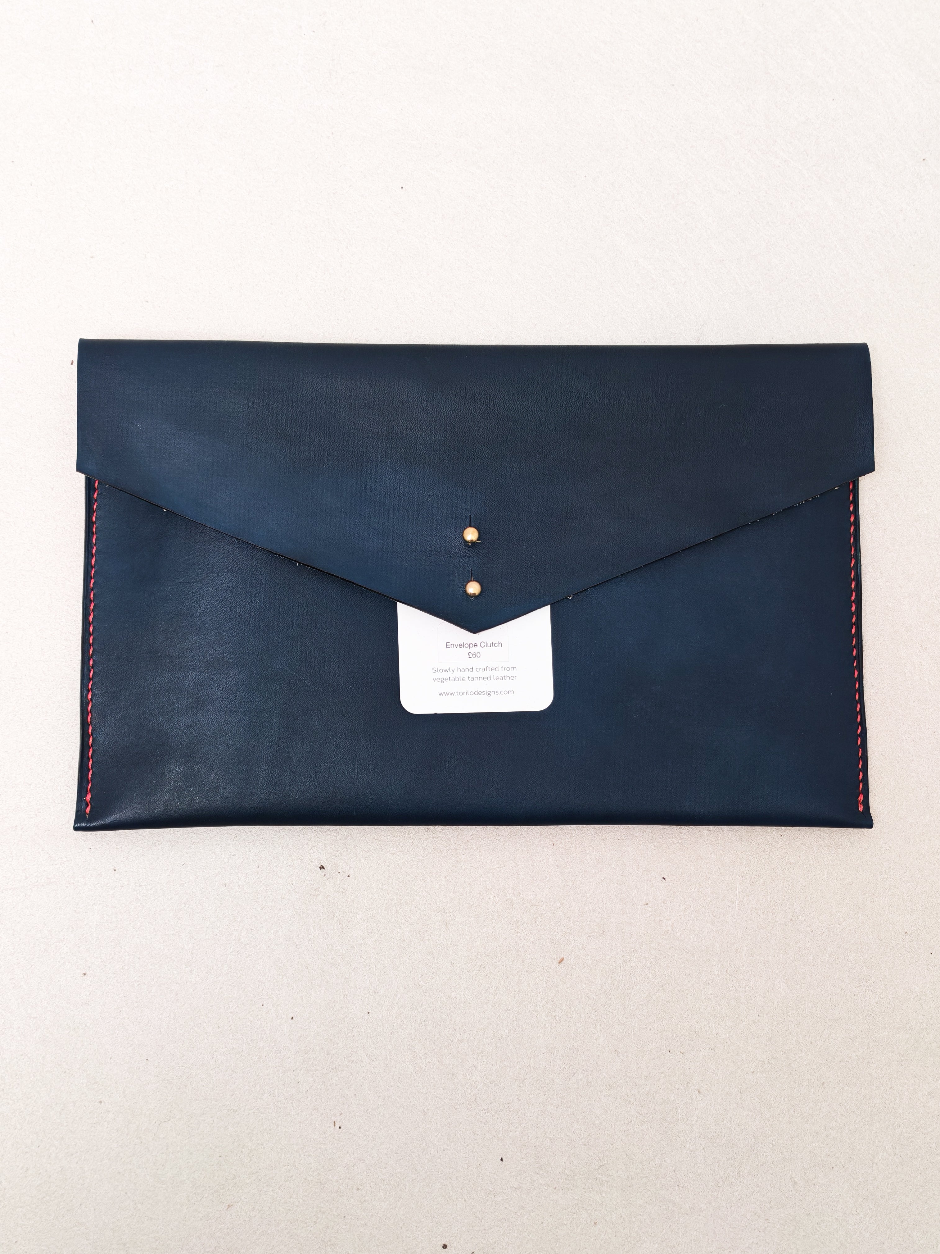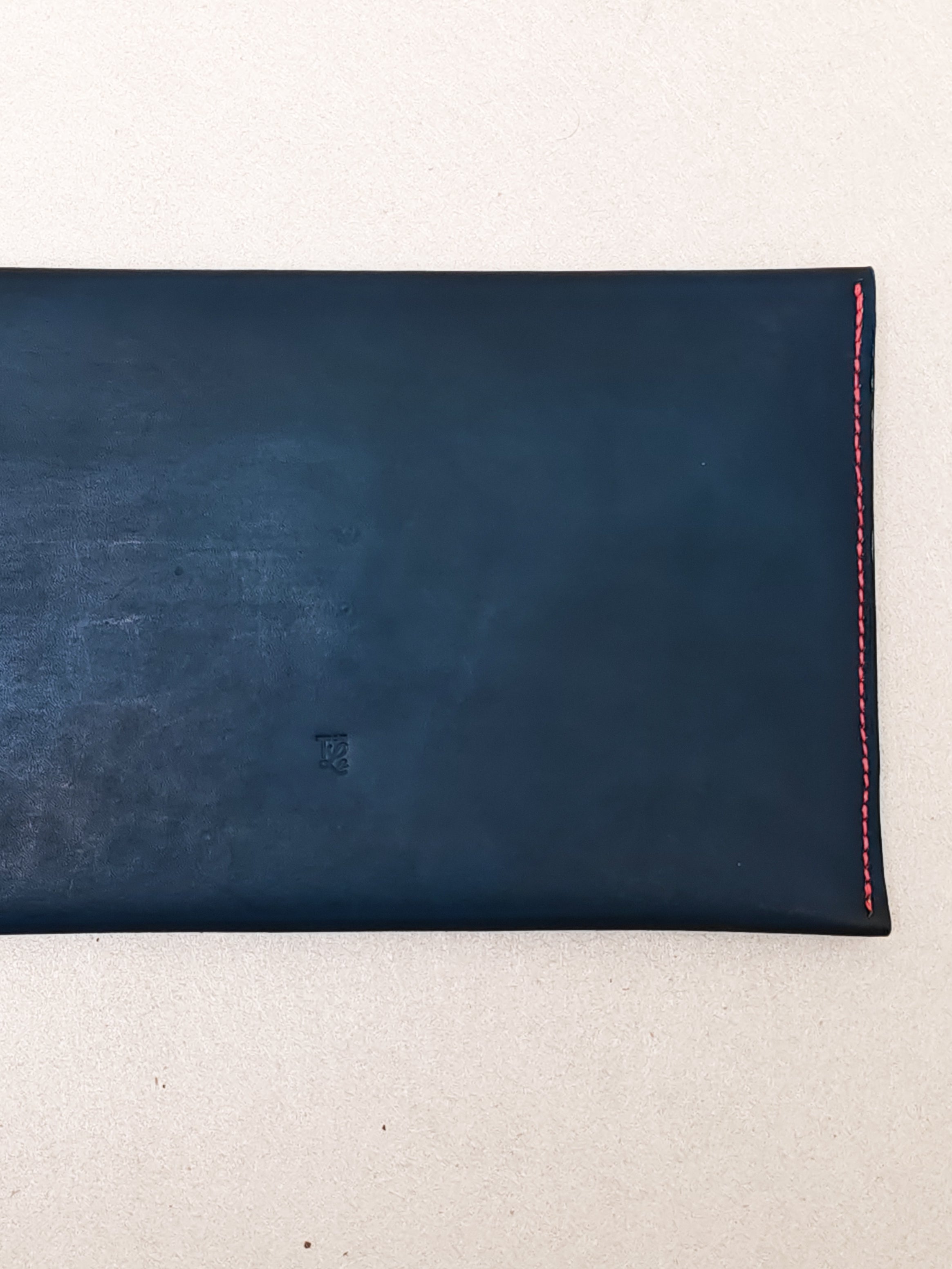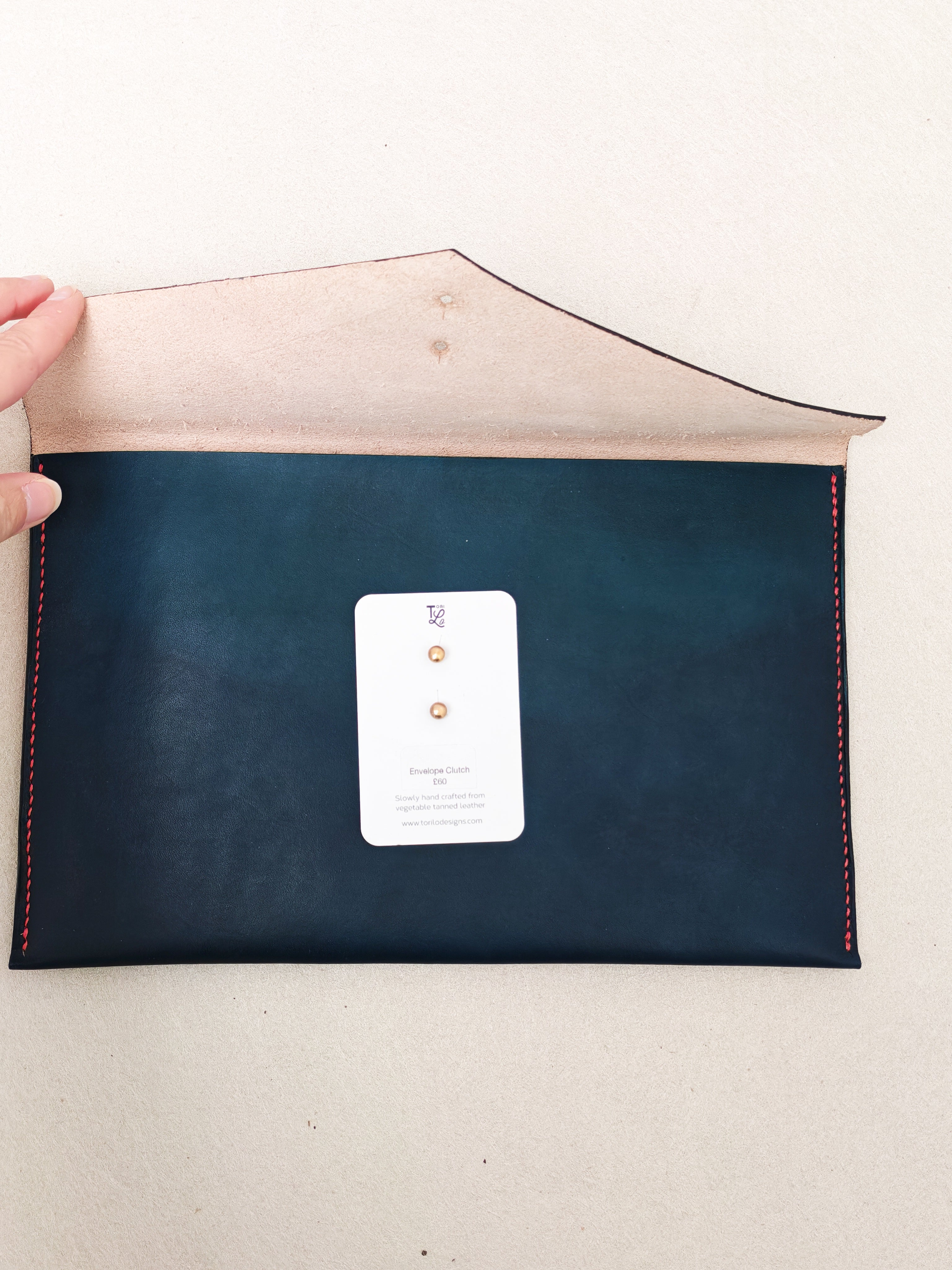 Dark Aqua Leather Clutch, with red stitch. Some signs of developing patina and darkening