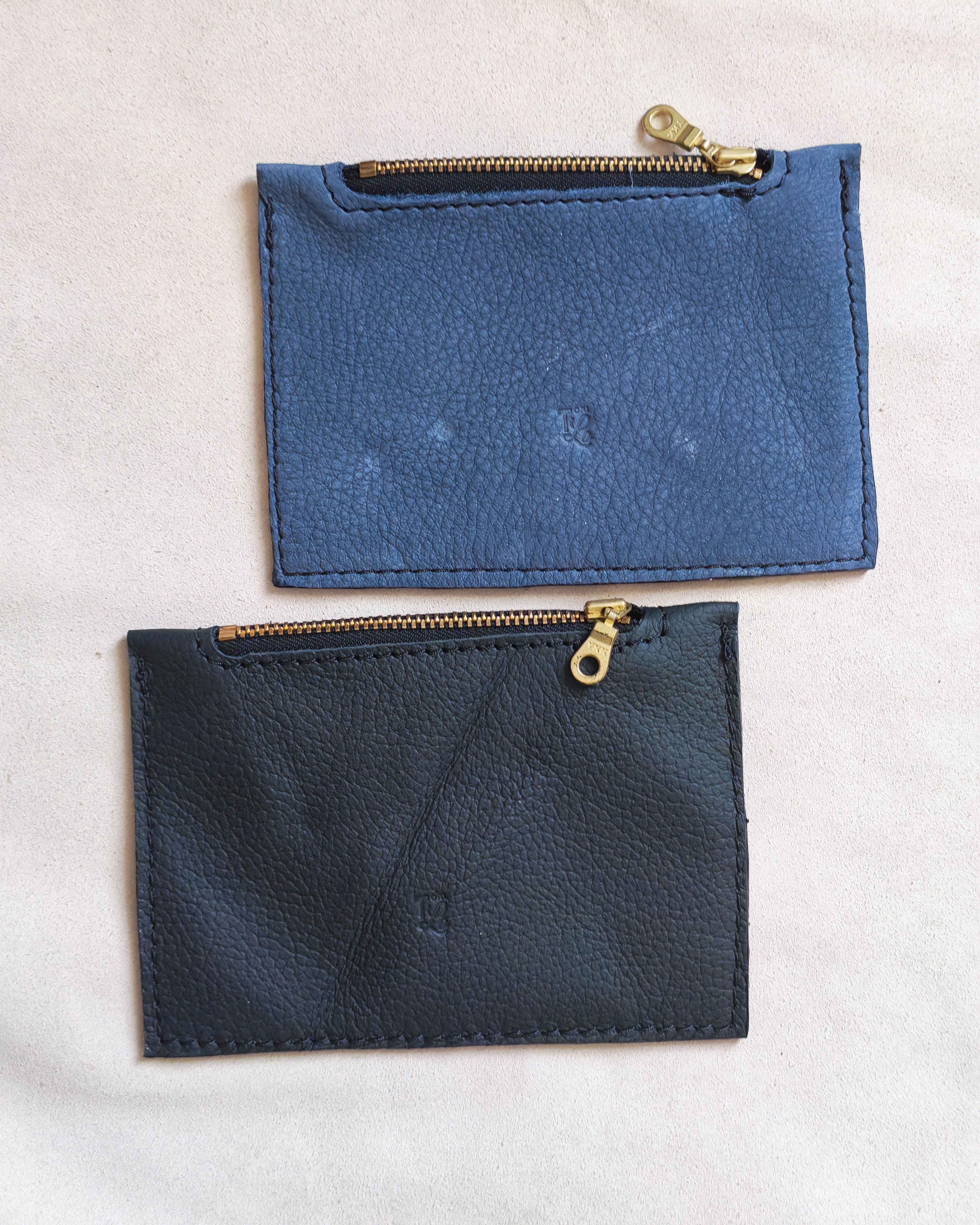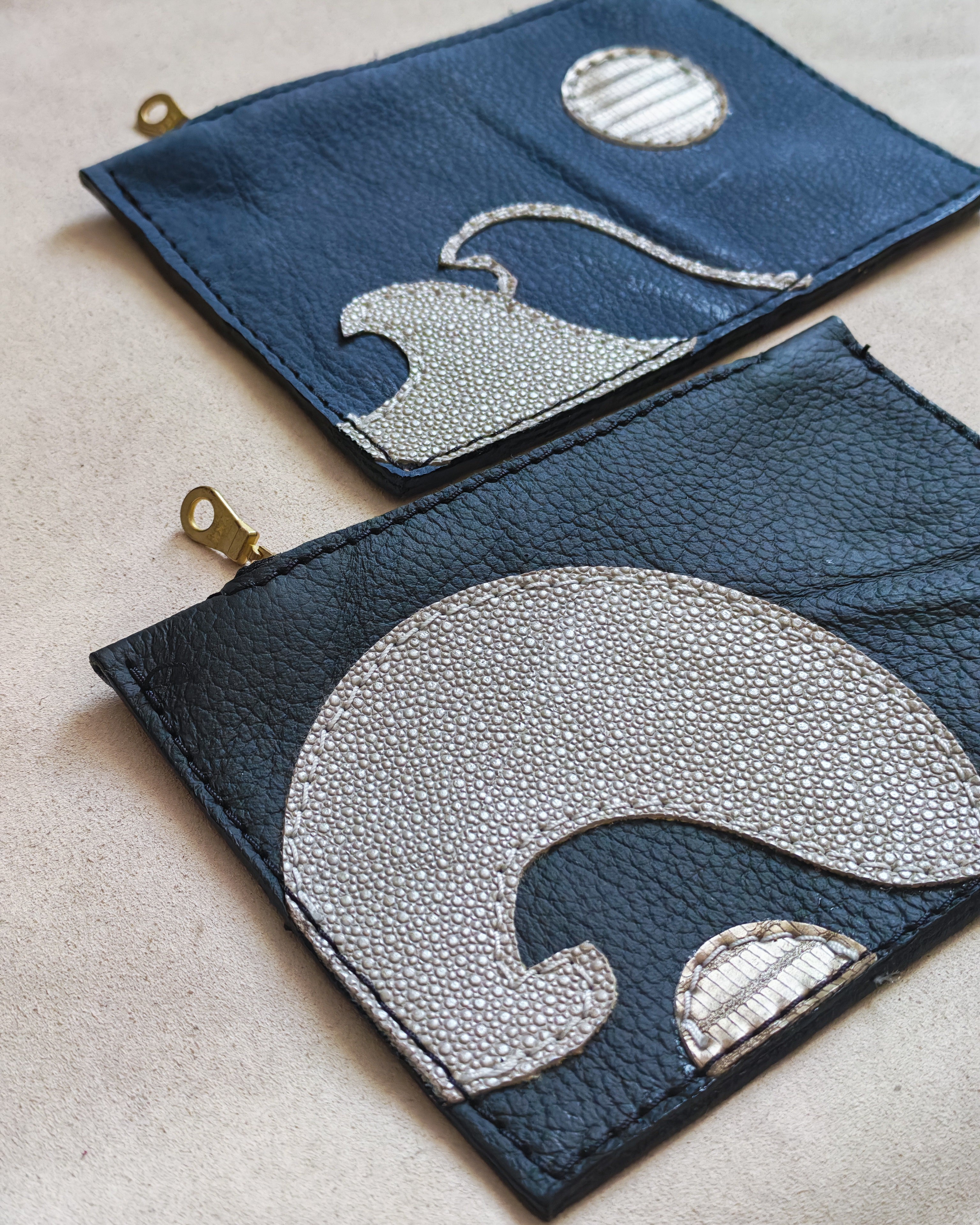 Zip purses created using leather waste from the furniture industry.